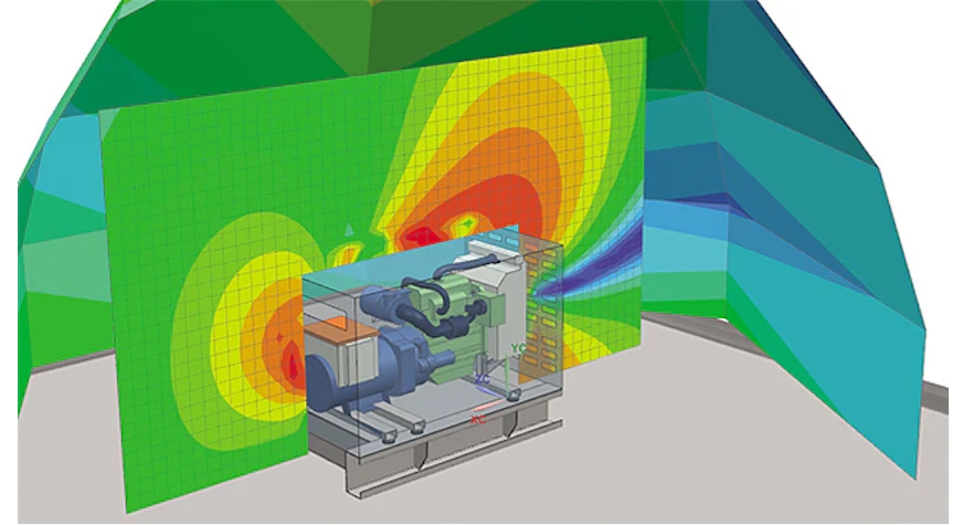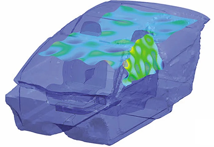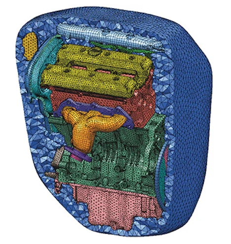 用于聲學分析的有限元法是室內聲學問題仿真的理想選擇。聲學有限元法不僅在解算速度方面更為高效,還讓您可以進行聲振耦合分析,同時將結構模態和隔音材料考慮在內。聲學有限元法還可以輕松用于解決外部聲學問題,例如動力總成組件(例如進氣系統、變速箱或全電動驅動單元)的噪聲輻射分析。
